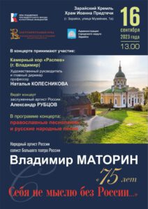 В Зарайском Кремле под сводами Собора Иоанна Предтечи прозвучит духовная музыка и русские народные песни в исполнении народного артиста России Владимира Маторина и Камерного хора «Распев» (г. Владимир). Художественный руководитель и главный дирижер хора Наталья Колесникова. Ведущий концерта заслуженный артист России Александр Рубцов.